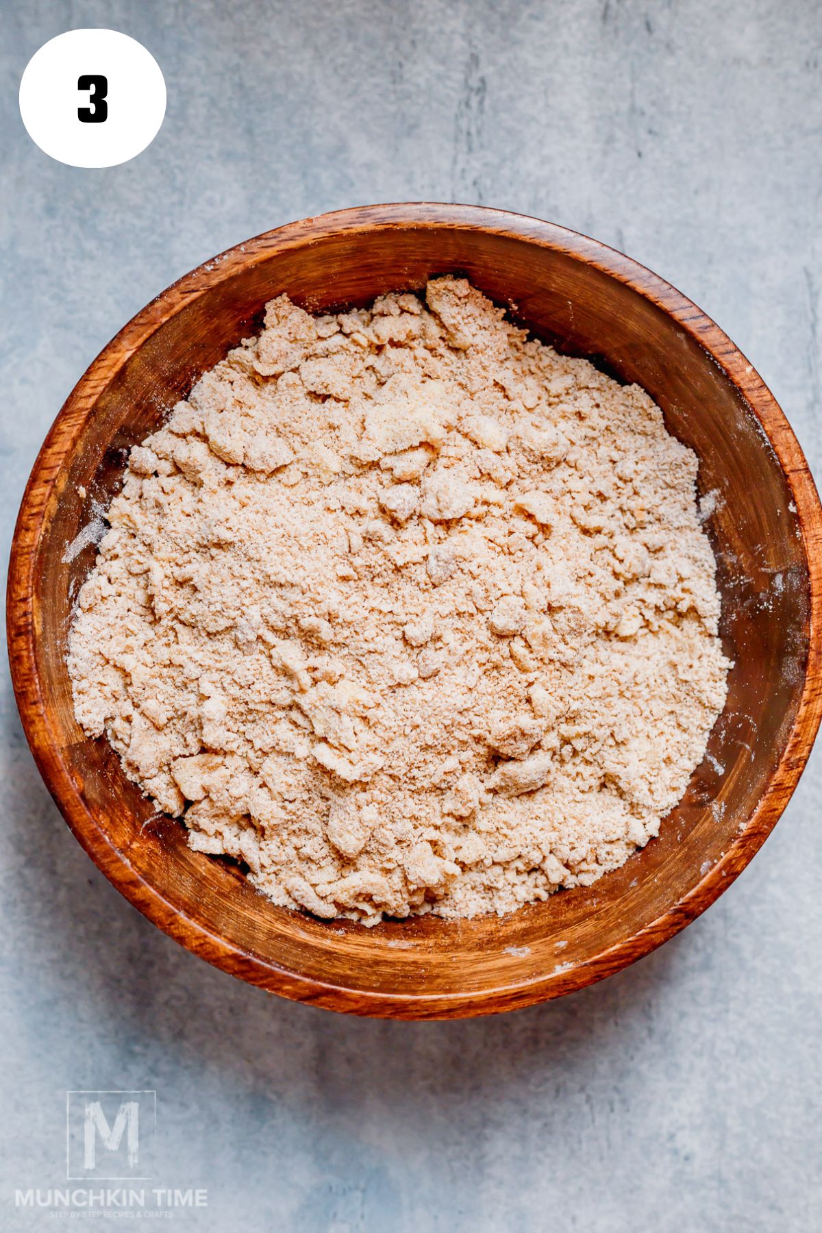 Step 1: In a medium bowl, combine the flour, brown sugar, cinnamon, salt, and coffee grinds if you’re using them. Cut in the cold butter using a fork or pastry cutter, until coarse crumbs are formed. Set that aside in the fridge.