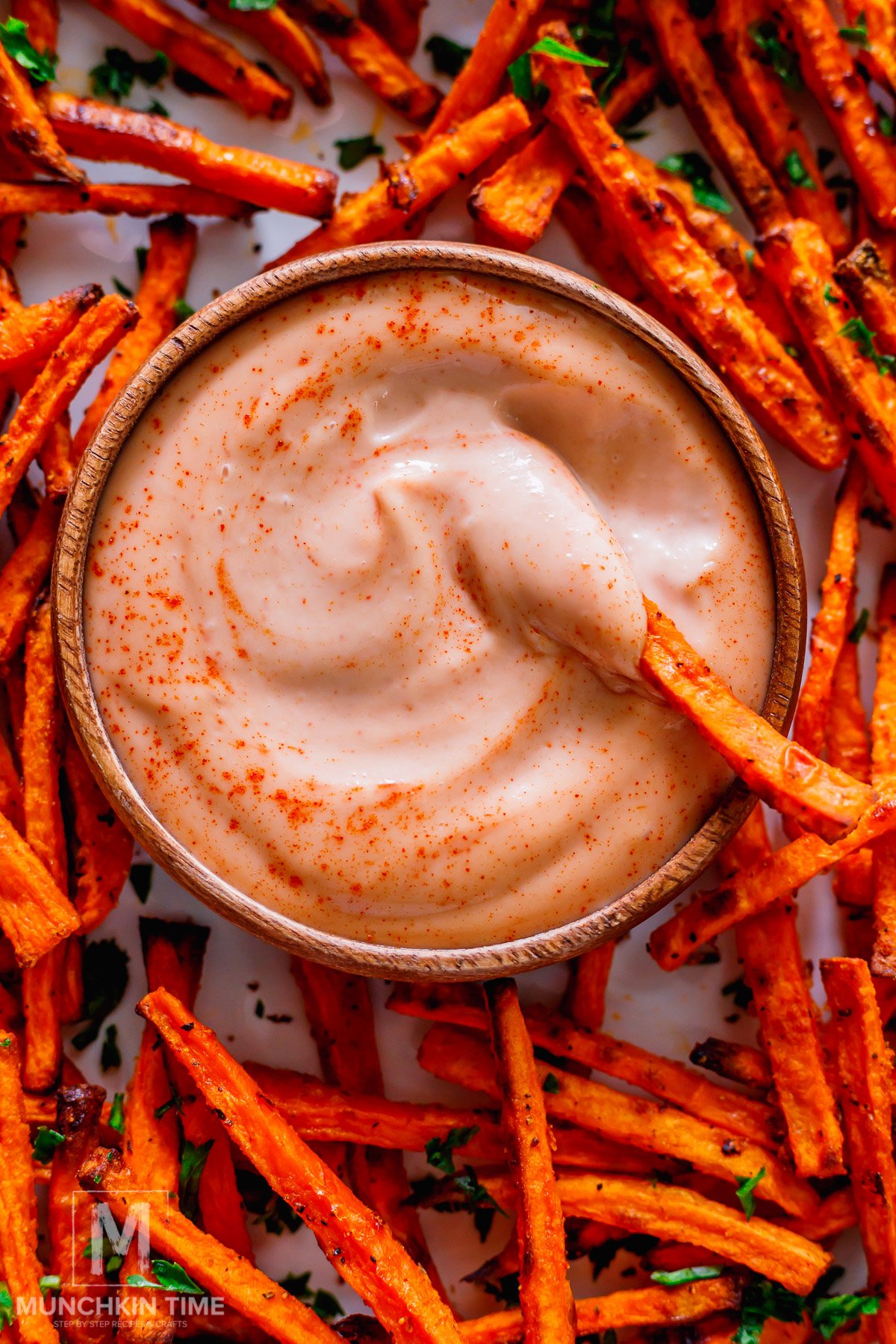 Serve the hot, crispy sweet potato fries with your homemade dipping sauce on the side. Enjoy immediately for the best texture!
