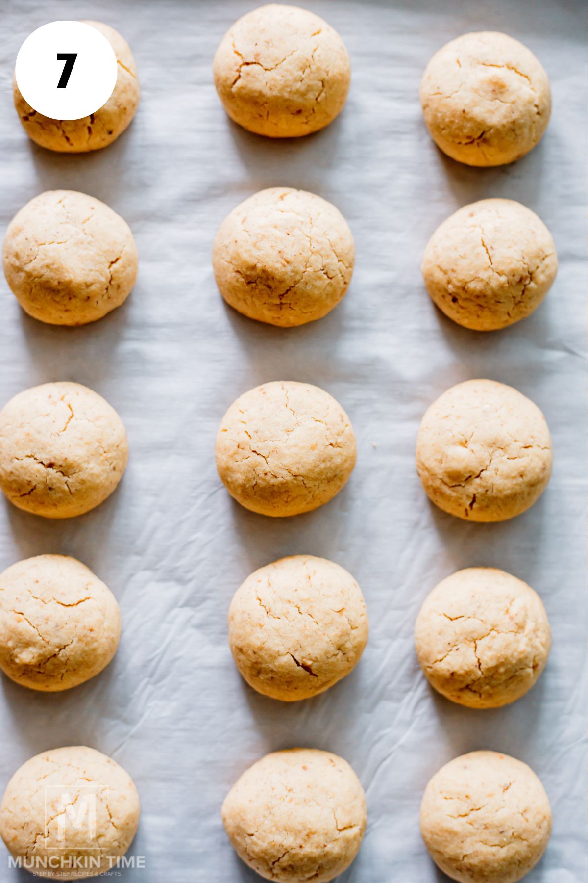 Step 4: Use a medium cookie scoop, or a tablespoon to scoop out the dough. Roll it between your hands to make a 1-inch ball and place each one on a parchment lined baking sheet. Keep them about 1 inch apart.
